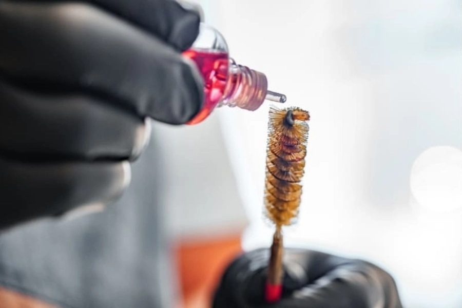 Aplica el solvente en las varillas con las escobillas y pásalas varias veces por el cañón. Usa parches de algodón para eliminar los residuos. Repite hasta que el parche salga completamente limpio. No olvides las partes móviles como el gatillo o el sistema de carga.